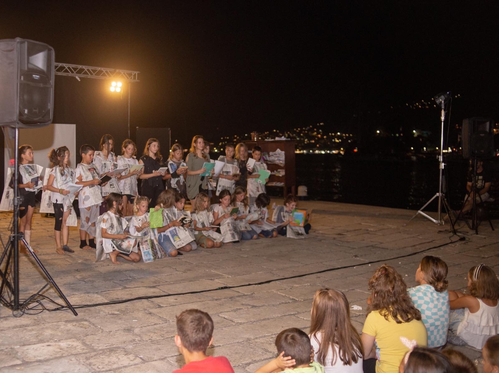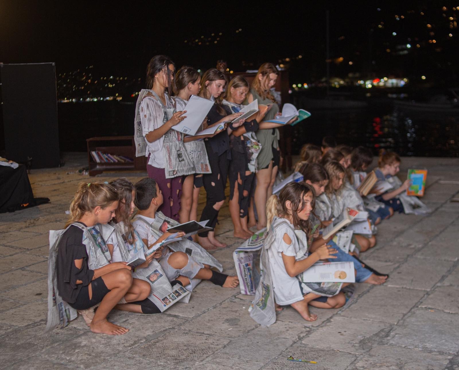 Sinoć dok su se nebom prožimale u daljini munje kao „lajt šou“ u jedinstvenom ambijentu, na gradskom mulu Škver, brojna publika je uživala u predpremijernom izdanju predstave „Izmedju korica“ u izvođenju članova Škole glume Maska iz Herceg Novog.