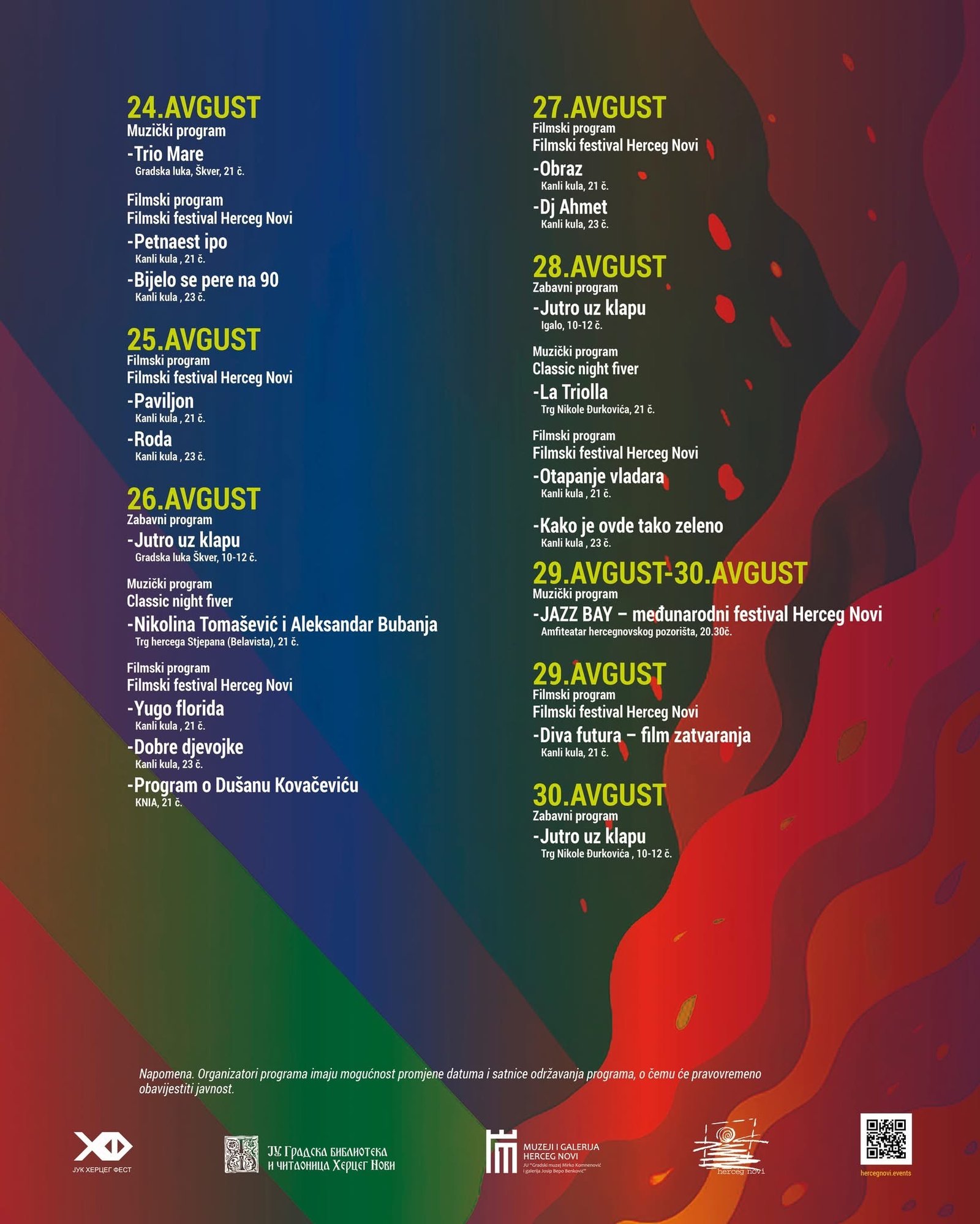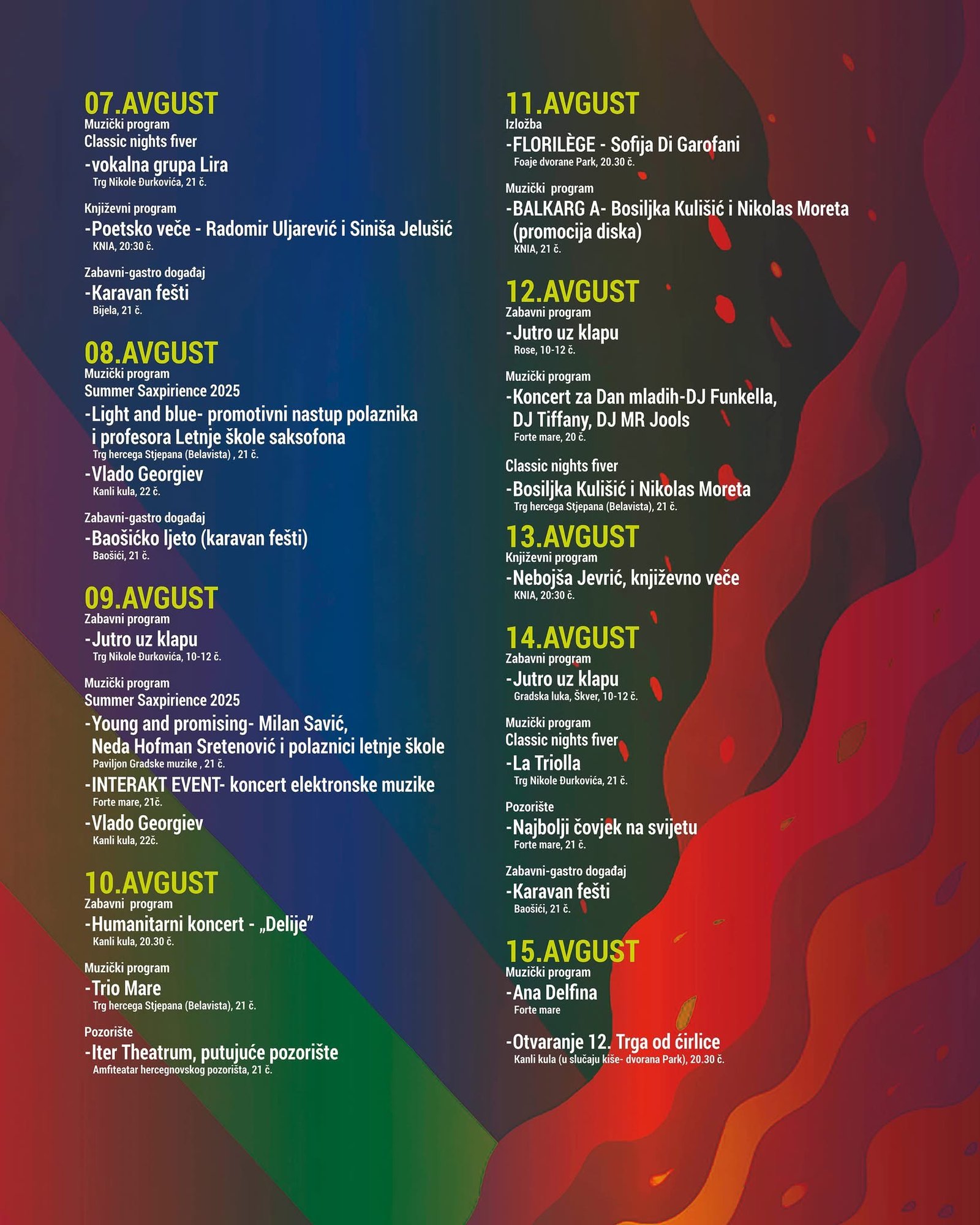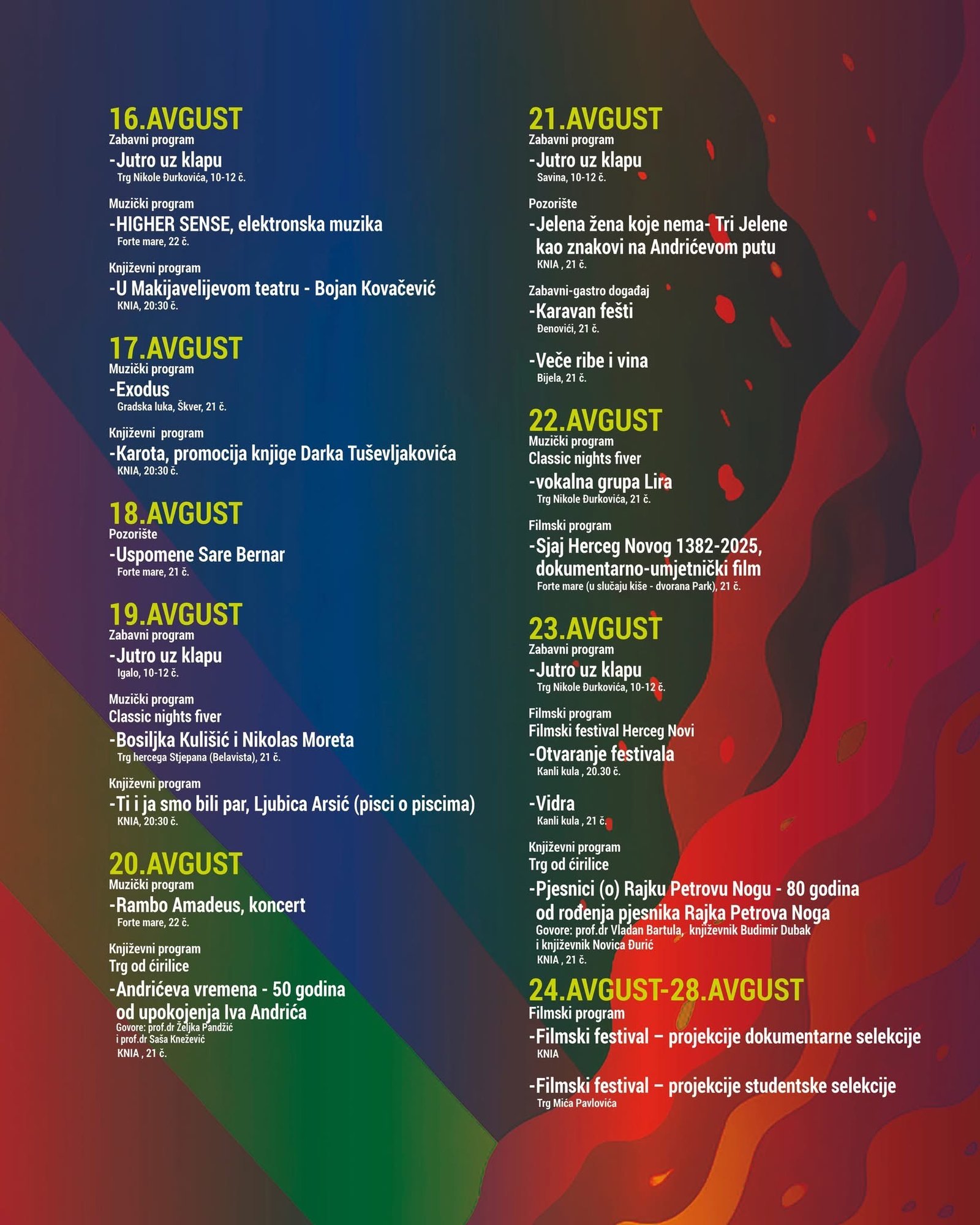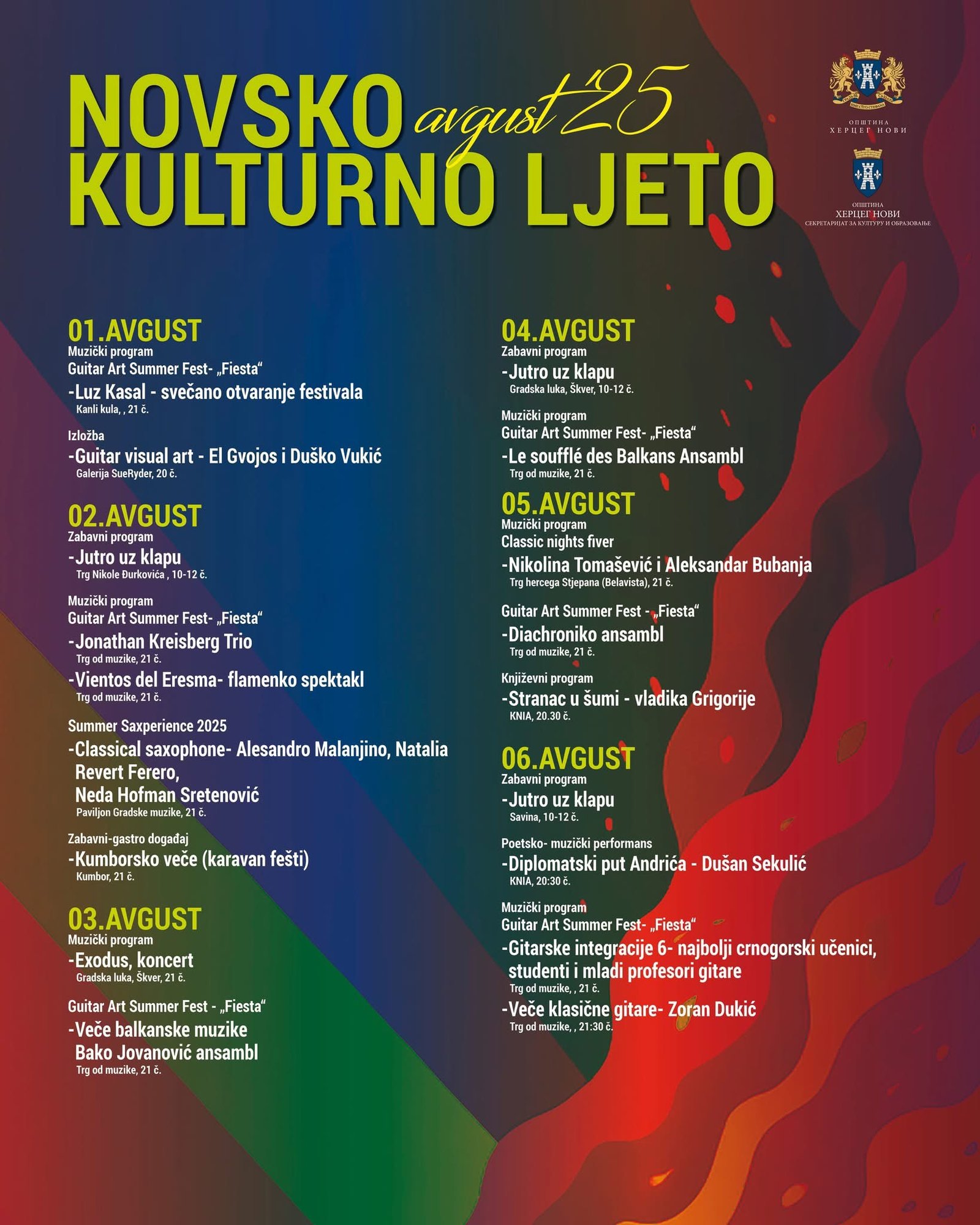 Sekretarijat za kulturu i obrazovanje Opštine Herceg Novi predstavio je kalendar kulturno-umjetničkih i zabavnih programa tokom avgusta. Građani i gosti našeg grada imaće priliku da uživaju u više od 80 muzičkih, zabavnih, književnih i filmskih programa.